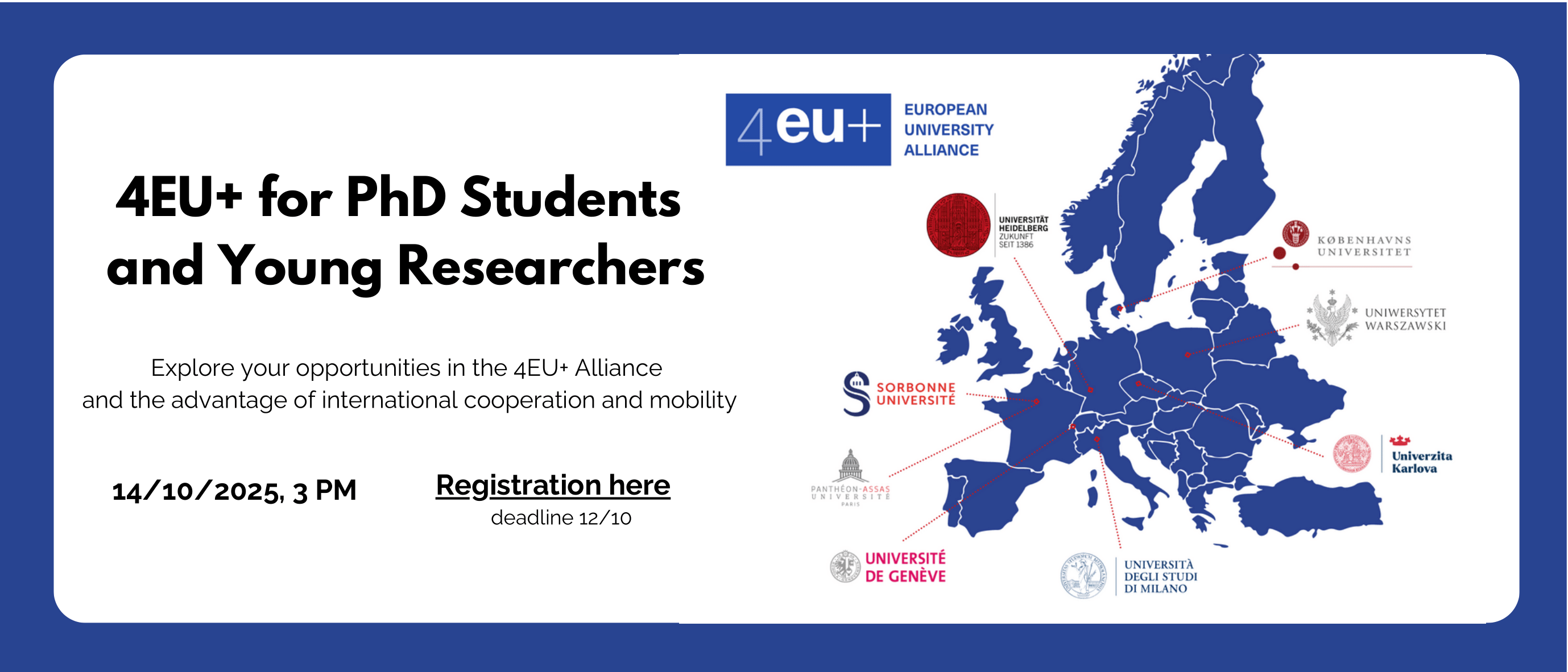 The 4EU+ Working Group Mobility cordially invites doctoral candidates, young researchers, and PhD programme coordinators to participate in an online infosession on 14 October 2025, 3:00–4:30 PM.